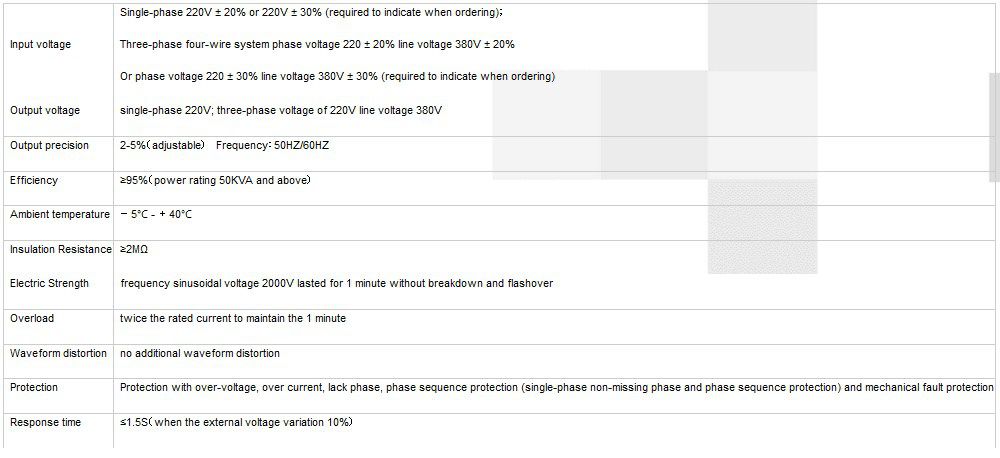 The DBW/SBW high-power electric power voltage-stabilized power supply is an energy-saving type product to stabilize the AC voltage developed in this company based on the introduction and absorption of the foreign advanced technology and combined with the existing power supply situation in the country, which, when the external distribution network voltage fluctuates or the voltage fluctuations result from load changes, keeps automatically the output voltage stabilized. This series product combines the advantages of the traditional electronic AC type, the inductive type and the magnetic saturation type voltage stabilizers, overcomes the shortcomings of the traditional voltage stabilizers, such as small capacity, large loss and great waveform distortion and has such merits as large capacity, high efficiency, no waveform distortion, smooth and stable voltage regulation and easy and convenient operation and maintenance and reliable running. Its voltage stabilization process is the use of a motor to drive the carbon brush to carry out the voltage regulation. They are widely used as the AC voltage stabilized power supply for the electronic computers, precision machine tools, computer tomography photography (CT), precision instruments, laboratory equipment, imported equipment and production lines in the industrial and mining enterprises, oil fields, railways, construction sites, schools, hospitals, post offices and telecommunication stations, hotels, research and other departments, and are also applicable to the end users of the low-voltage distribution network that is low in the power supply voltage and large in fluctuation amplitude and the electricity-use equipment great in load fluctuations, especially to the voltage stabilized places that have high requirements for the waveforms.