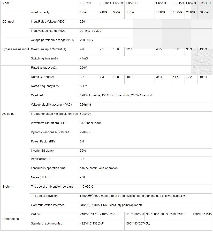 The EK500C (DC220V) industrial frequency inverter power supply is the fourth generation of the industrial frequency intelligent inverter power supply developed, aiming at the high power reliability requirement in the power plants and the substations and with the fully-new digital technology, which, using the SPWM pulse width modulation technology, the IGBT power modules and the output isolation transformer, makes the output from the inverter power supply a purifying sine wave power supply with frequency stabilized and voltage stabilized, mixed noise filtered out, no interference from the grid fluctuations and low distortion, has such characteristics as strong load-carrying capacity, good load compatibility and wide DC input voltage range, so as to fully meet the needs of a variety of the electricity-use environment;its perfect protection devices have improved the system operation stability and reliability;its humanized LCD interface design ensures that there should be zero distance in the communication between the man and the machines;communication can be carried out between the inverter and the PC via the RS232 communication interface, thus allowing the users to observe easily at any time the working conditions and the historical records of the inverter in the terminal unit, to carry out control of the inverter in a timely manner, and, in the meantime, through the remote network monitoring functions, via the network to carry out remote monitoring and management at any time and any where, thus having truly fulfilled the unattended function, composed a hot backup system and improved the system reliability. Adhering to the design concept that the stability is above all, the EK500C series inverter power supply is undoubtedly your best choice.