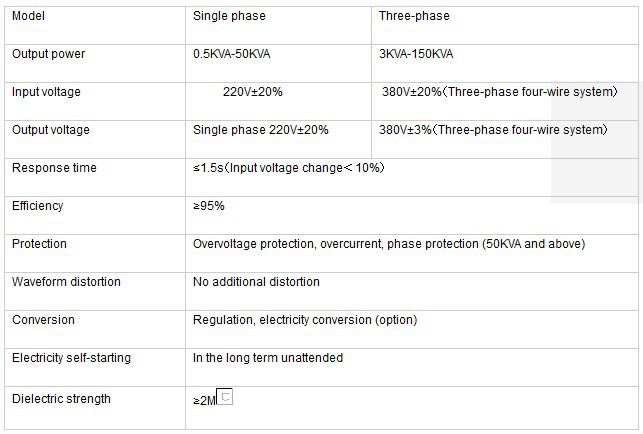 The SVC high-performance fully-automatic AC voltage-stabilized power supply is composed of such components as a contact-type self coupling voltage stabilizer, a servo motor and an automatic control circuit, which is a popular type of the AC voltage-stabilized power supply that uses a servo motor to drive the carbon brush to change the number of the coil turns of the speed regulator to complete the voltage stabilization function. When the grid voltage is not stable or the load power changes, the automatic control circuit drives the servo motor according to the output voltage change and adjusts the position of the carbon brush in the contact-type self coupling voltage stabilizer to adjust the output voltage to the rated value, so as to achieve the automatic voltage stabilization. This series power supply, characteristic of such advantages as wide voltage stabilization range, high precision, no additional distortion in the output waveform, high efficiency and strong load adaptability, is widely used such electric equipment as computers and their peripheral locations, medical electronic equipment, radio communication and broadcasting equipment, air-conditioning and industrial production lines and is widely used as well in the household electric appliances for the voltage stabilization and protection.